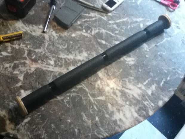 4. Enroscar los tapones terminales en los extremos. utilizando el agujero creado por el tornillo de la Sierra de hoyo las tapas de la barra con tornillos de 1 1/4". longitud del tornillo puede variar dependiendo de lo que tienes en la mano. regla es que por lo menos tanta mordedura como el grueso de lo que tu va a.