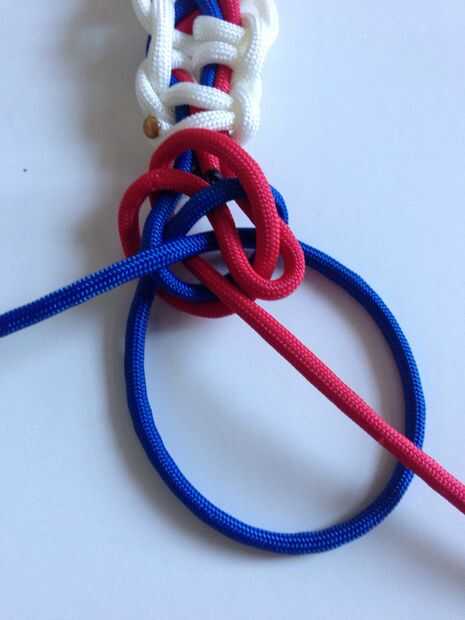 No coge la hebra azul y ponlo a través del centro al lado de la hebra roja que se acaba de poner en el centro.