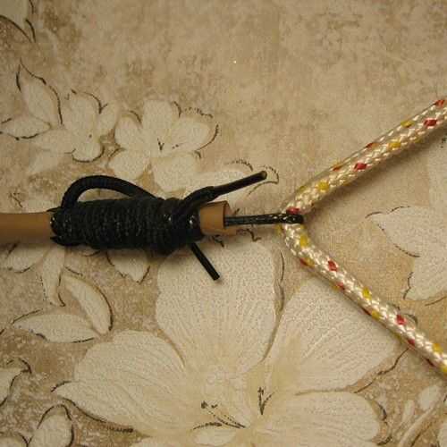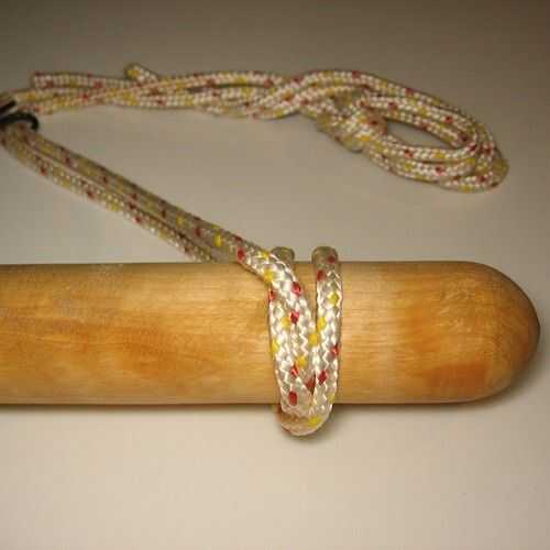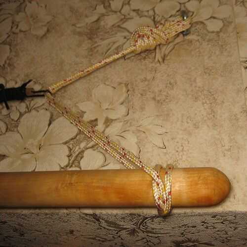 La barra es colgada en las dos piezas de cuerda. A cada lado el nudo constrictor se utiliza para unir el centro de la cuerda hasta el final de la barra. Entonces el lazo de nudo as de guía se hace con los dos extremos de la cuerda juntos. Longitudes deben ajustarse de modo que libremente barra de colgar en su lugar.
