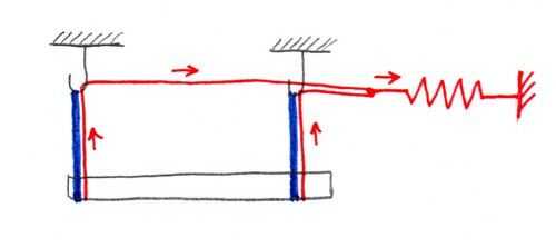 Entonces el mecanismo de elevación. Un trozo de cinta de goma (todo lo que se puede utilizar) se une a los centros de las cuerdas verticales para que cuando no hay ninguna carga, se levanta la construcción. En esta posición las cuerdas y la goma de la cinta forma un ' >---<' figura. Cuando jale la barra hacia abajo, la goma se estira y permite a todos ir a ' |---|'.