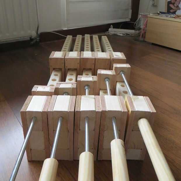 Estoy pensando en hacer un combo de escritorio mesa de trabajo multipropósito para trabajar la madera en el futuro cercano. para mantener el costo de esa mesa de trabajo baja, he decidido hacer todo de madera contrachapada y mdf. Esto incluye las piernas 5 capas de madera contrachapada etc.. Para ello necesito un montón de pinzas, preferiblemente grandes así que pueden abarcar toda la tabla. Ya que ahora solamente tengo 2 pinzas decidí empezar a construir la barra pinzas de madera.