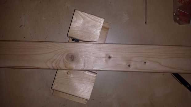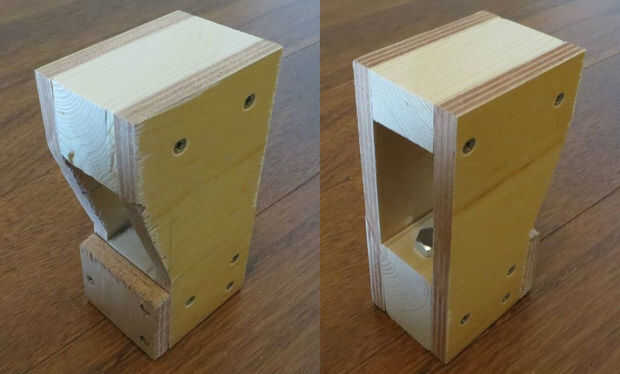 Una vez que los ángulos se cortan puede perforar el orificio donde debe ir y poner el perno de retraso en el perno de retraso. Ahora tienes dos opciones, ensamble final antes de cortar la madera contrachapada a la forma o viceversa. Primero ensamblado final y cortar luego con una sierra de mano, pero probablemente es mucho más fácil montar el final después de cortar la madera con una sierra de calar.