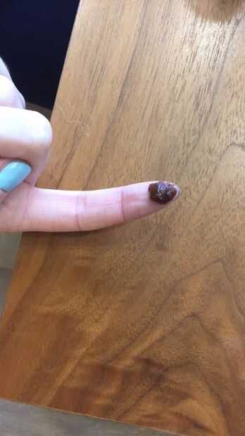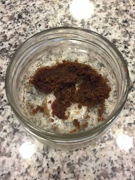4. sumergir el dedo índice en el matorral de labio y asegúrese de que una pequeña cantidad (aproximadamente del tamaño de un chícharo) se pega a tu dedo. Nota: colocar algo en su regazo para atrapar cualquier exfoliante (p. ej., toallas de papel). (Foto 2)