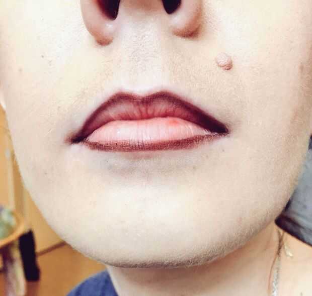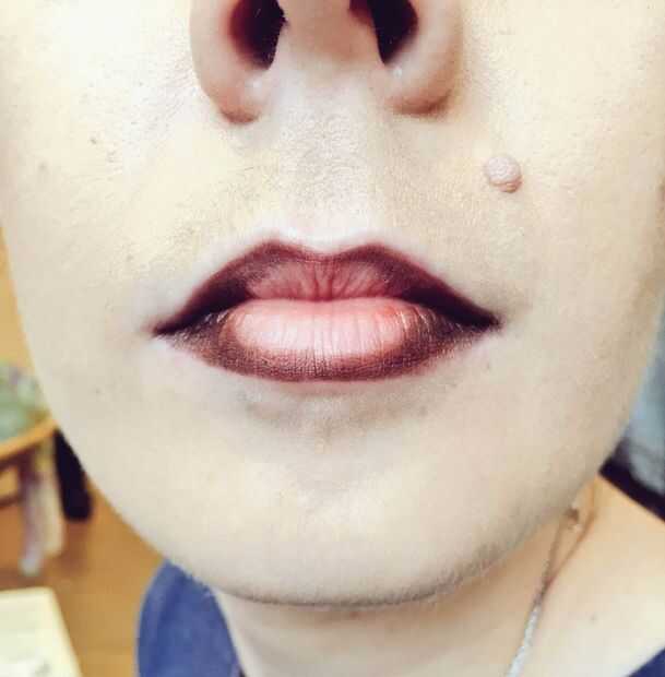 18. con el borde afilado del lápiz, aplicar revestimiento a la parte exterior de su labio superior (donde cambia la pigmentación). (Foto 1)