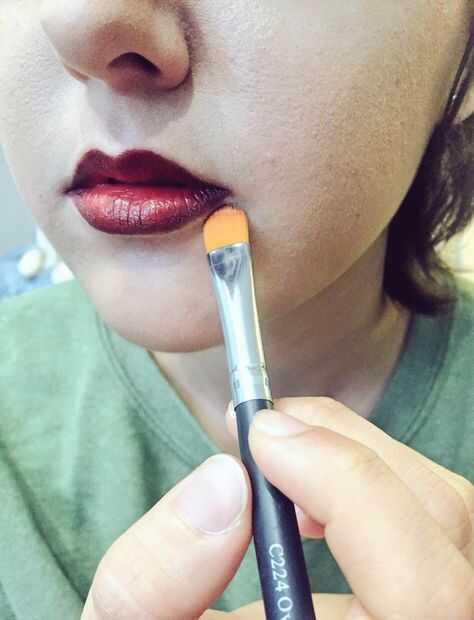 36. a partir de la parte exterior del pliegue de la línea del labio, la Fundación en su piel y arrastre el pincel contorno a lo largo de la parte exterior de la línea del labio para el otro pliegue exterior de la línea de labio.