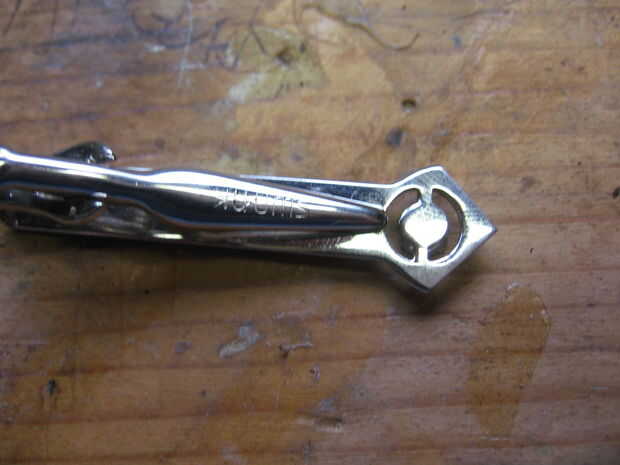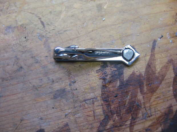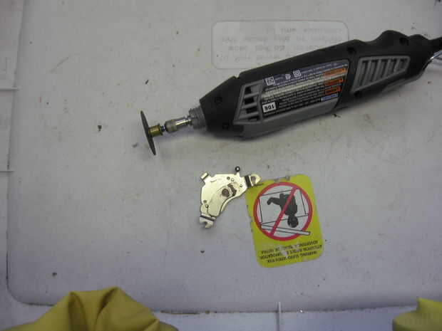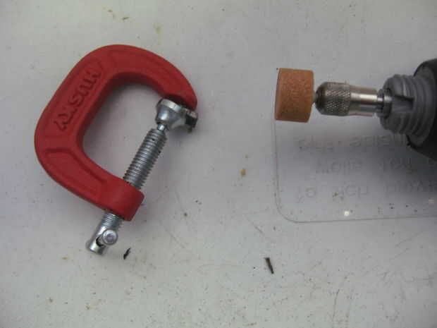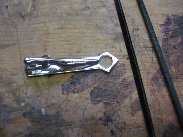 Una vez que el agujero fue alisado hacia fuera la usé como plantilla para marcar el imán para el corte. Con él marcó coloqué el imán en mi sistema de colección de polvo y usa mi Dremel con un disco de corte de metal para hacer un par de cortes brutos en el imán. Luego cierren el imán en una pequeña abrazadera en C y utiliza un esmeril para refinar la forma del imán. Cuando era pequeño bastante aseguró en el agujero con E-6000, asegurándose de que la parte posterior del imán estaba al ras con la parte posterior de la barra de conexión. Esto es para minimizar la posibilidad de que el imán se enganchen en mi corbata. Esto deja el frente del imán ligeramente levantado en la parte frontal de la barra de conexión, pero no parece está levitando.