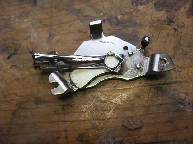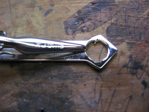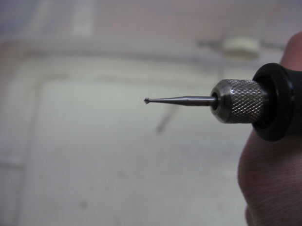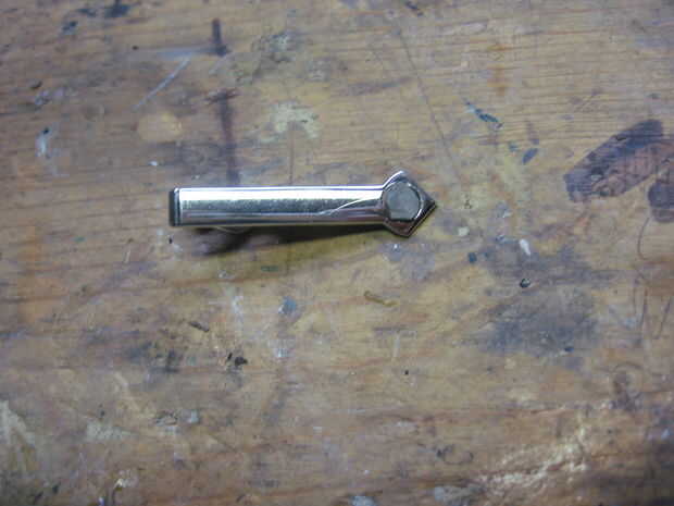 Así que empecé con una barra de lazo que tenía los ingredientes de un buen agujero ya y un imán relativamente plano. Usé una broca cortadora para alta velocidad en mi Dremel dentro de un sistema de colección de polvo al cortar las dos puntas que sostienen la decrotive broca en el agujero. Entonces utilicé aguja archivos para limpiar los bordes del agujero.