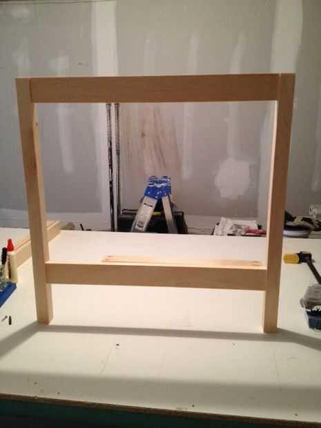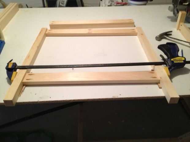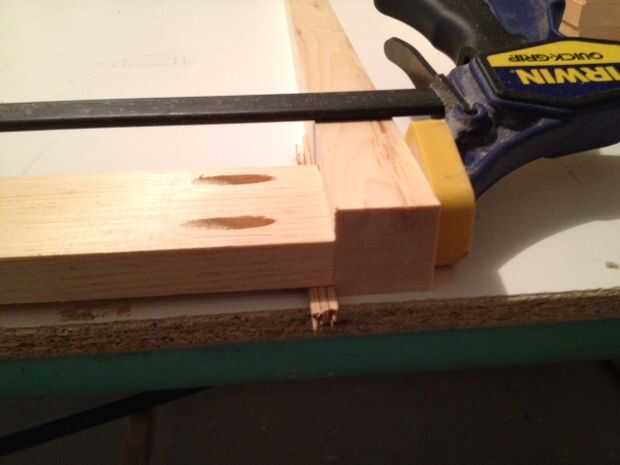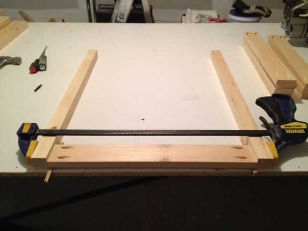 Tomar las 2 piernas y establecen en la tabla. Luego tomar 1 superior (ancho) y 1 fondo (ancho) y colocar entre las dos piernas. Usé dos trozos de madera de desecho a aproximadamente 3/16" de espesor para dejar un revelan donde se unen la falda y la pierna. Comience con la falda superior y piezas pinza los tres juntos y entonces usted puede atornillarlos. (No uso pegamento para esta parte porque pegando veta cualquier cosa es bastante inútil.) Repita la fijación y atornillado para la falda de la parte inferior.