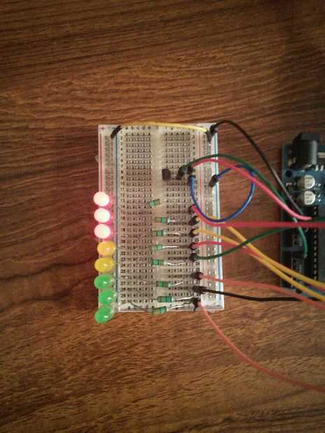 Para empezar busque 8 LEDs de colores preferidos y puso en su protoboard, pata positiva en las vías principales, negativas en el carril de tierra.
