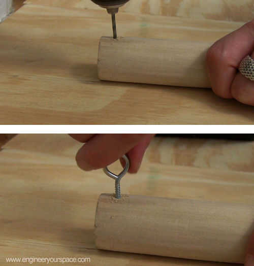 Perforar agujeros y poner tornillos de ojo en cada extremo de la espiga (estos se utilizará para colgar el taco). Si no tienes un taladro, puede utilizar un clavo y un martillo para hacer un agujero piloto. Si desea colgar carteras la barra para colgar, puede agregar más ganchos de ojo en el lado opuesto de la espiga.