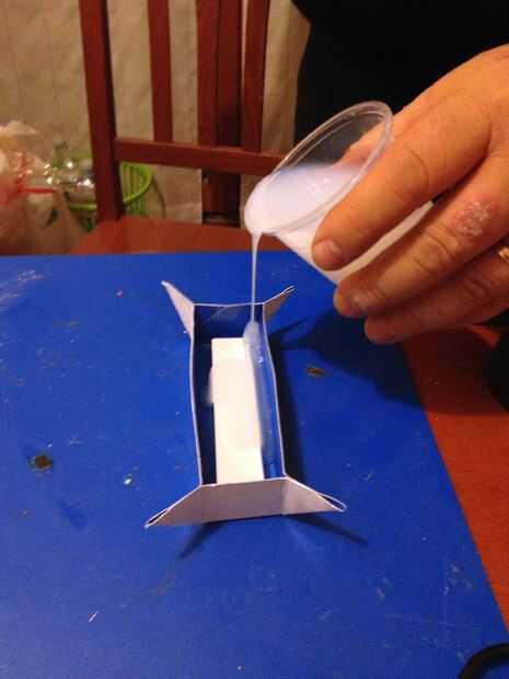 Rápidamente la mezcla en la caja con la barra en el medio y el bajo relieve en la parte superior del molde.