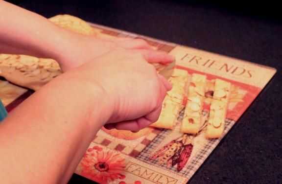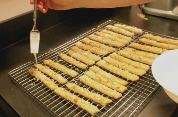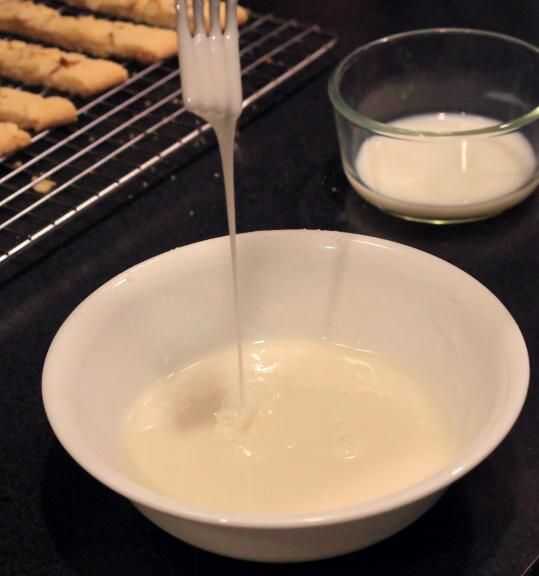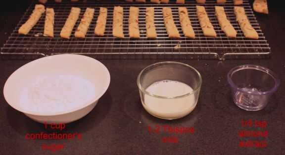 Transferencia de las barras de galleta, uno a la vez a una tabla de cortar. Cortar las barras de 1" ancho diagonales rodajas. y en un estante de enfriamiento grande, dejando un pequeño espacio entre cada galleta. En un tazón pequeño coloca una taza azúcar glas. Añadir Extracto de almendras 1/4 de cucharadita y 1 Tbspn leche * y revuelva con un tenedor. Es muy probable que la guinda será clumpy en este punto, con un montón de azúcar izquierda para mezclar. Agregar más leche *, un poco a la vez, revolviendo hasta que tenga un suave glaseado rápidamente se cae de la horquilla. Llovizna en un ángulo a través de múltiples cookies como vas. Permiten establecer durante aproximadamente 5 minutos.