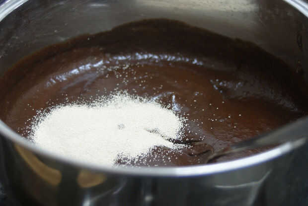 Vierta el chocolate base en un pote y calor revolviendo hasta que se siente agradable y cálido en el dedo pero no quema. Agregue la levadura seca instantánea. Deja la mezcla reposar 10 a 15 minutos la levadura disolver y empezar a trabajar. Revuelva otra vez — verá burbujas agujeritos mientras revuelve.