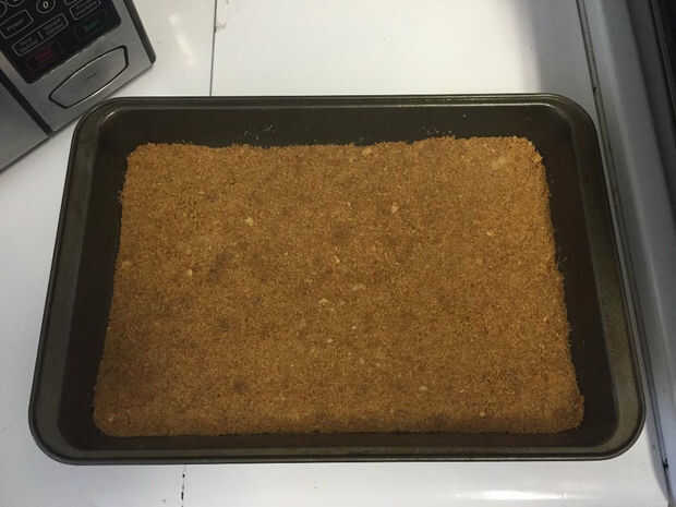 Precalentar el horno a 400 grados. Línea un 13 × 9 pulgadas para hornear con papel sulfurizado y hornear spray. En un procesador de alimentos o licuadora moler las galletas a una consistencia de migas (yo usé dos mangas de galletas). Añadir los ingredientes restantes y mezclar. Extensión de la corteza en la bandeja para hornear, presionando hacia abajo firmemente. Hornear durante diez minutos, luego deje que se enfríe. Preparar el relleno.