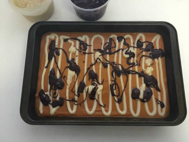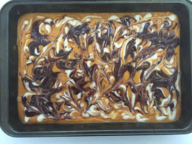 Preparar una manga pastelera para el queso crema y la ganache. Apriete remolinos de cada uno sobre el relleno. Use tan poco o tanto como usted como. Esta parte es completamente gratis para todos. Arremolinaba el queso de crema y ganache con un cuchillo para crear un efecto de mármol. Hornear durante 50 minutos. Deje que se enfríe antes de devorar.