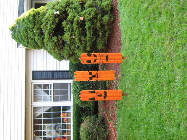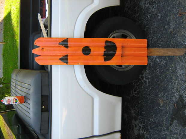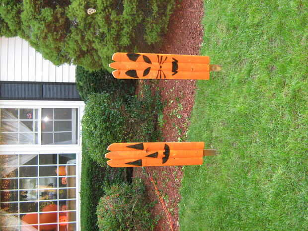 Hecho, dejar que el dolor seco y poner la calabaza de piquete en la tierra.  "Pre" hice los agujeros en la tierra para las estacas con un viejo pedazo de madera y un martillo (más fácil que tratar de aprovechar la calabaza de piquete de la tierra).