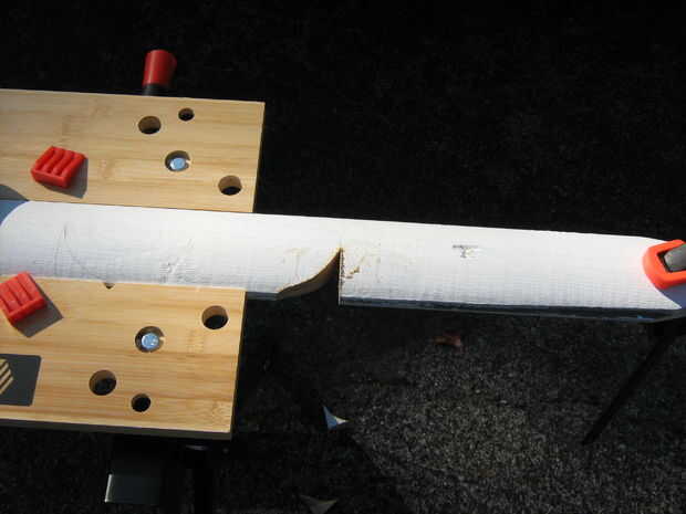 Tome otro piquete y línea las espaldas de las dos barras (una con las líneas dibujadas en él). juntos. Te recomiendo las dos barras de sujeción juntos. A continuación tome su sierra de calar y corte las 2 rectas, entonces los círculos de 1/8 de las dos barras. Esto le dará los dos lados de la cara. Cuando termine, combine las 2 barras con un tercero para el centro hacer la calabaza de piquete.