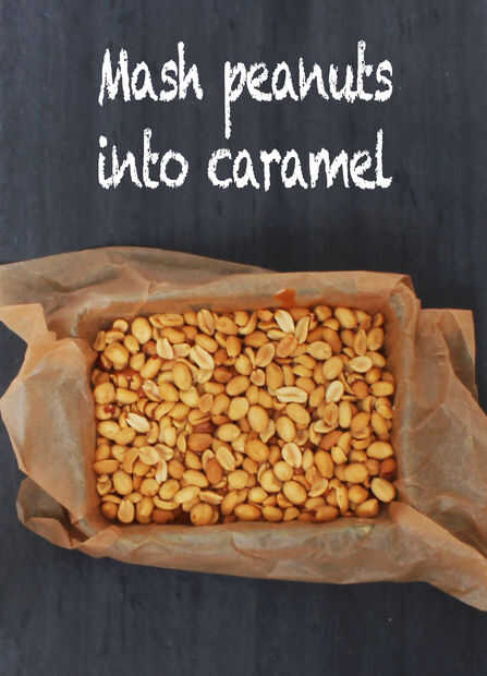 Puré como gran parte de los cacahuetes en la capa de caramelo como puedas antes de que establece.
