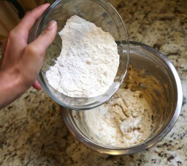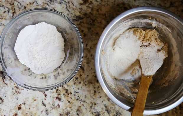 Verter lentamente en la mezcla de harina, batiendo todo el tiempo