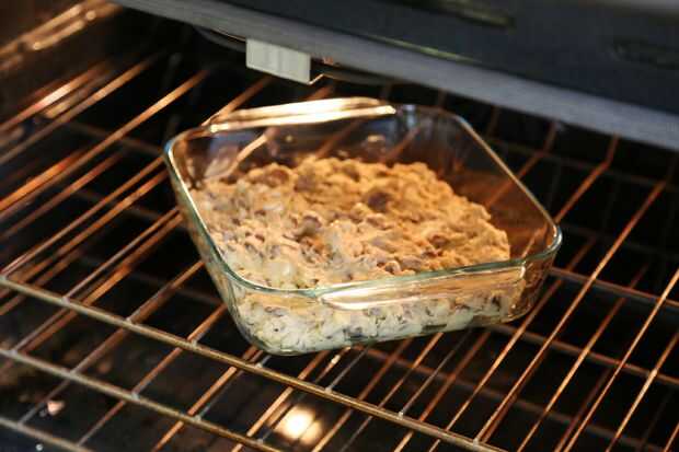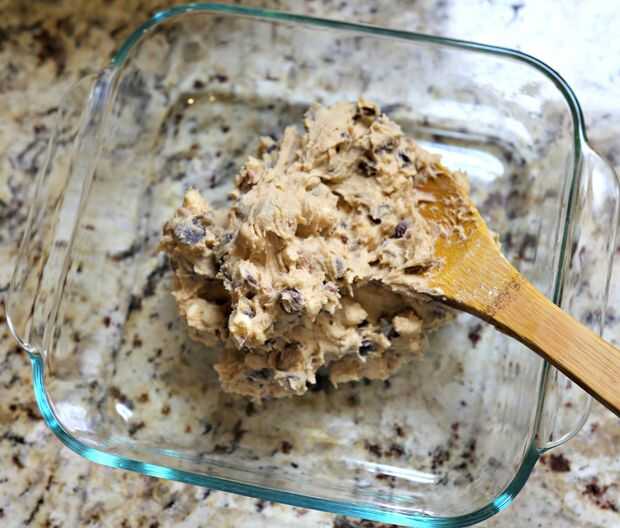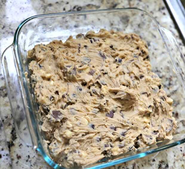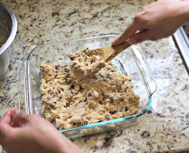 Engrase ligeramente un cuadrado de 9 pulgadas hornear. Añadir en la masa, que es bastante gruesa, así vas a tener que extenderlo con una espátula todo el plato. Arrojar en el horno precalentado a 375'
