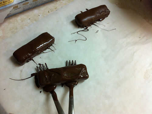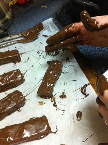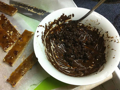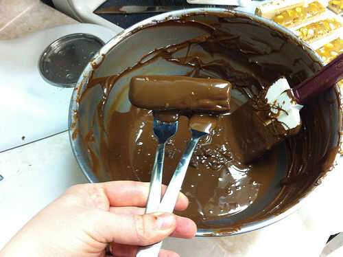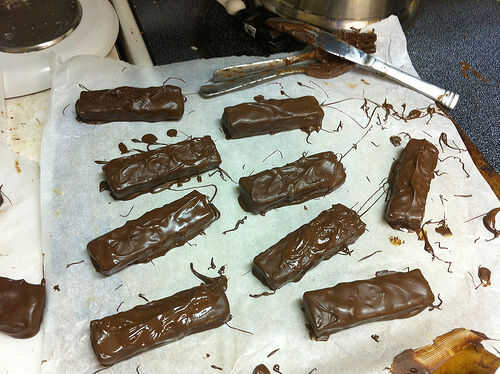 Coloque las barras en el chocolate derretido. Con los dedos si eres rápido o dos tenedores, raspar el chocolate sobrante y coloque la barra de caramelo en un pergamino que se enfríe. La versión desmenuzable de turrón no deje bits detrás en el chocolate, si usted ya la cubrió con una fina capa de chocolate.
