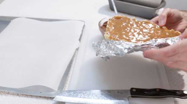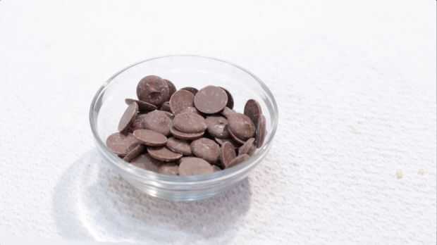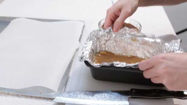 Ahora nos derrite nuestra Luz cacao caramelo se derrite o el bar de 7 oz de chocolate. Derretir en el microondas en ráfagas de 30 segundos, removiendo entre continuación, una vez que se derrita casi totalmente, de microondas por unos 10 segundos para acabar. Alternativamente usted puede derretir en tu estufa utilizando el método del baño María. Ahora sacar la Chocolatina base de la nevera y sacarlo de la bandeja y el papel de aluminio. Debe salir con facilidad.