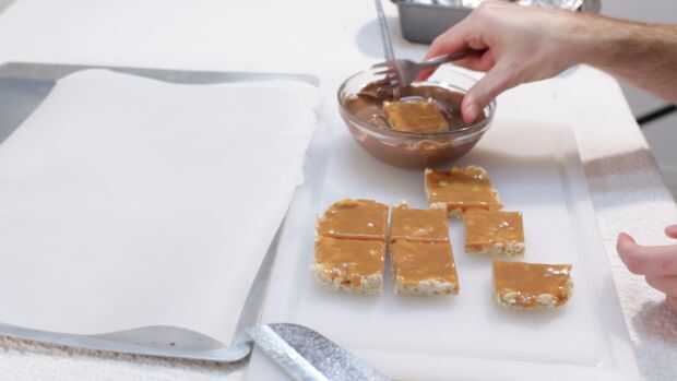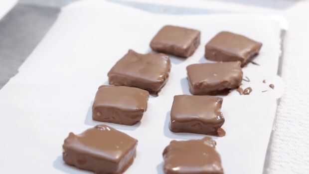 Ahora tenemos sólo sumergir las barras de nuestro chocolate. Caer en, utilizando una cuchara, la cuchara de chocolate en la parte superior, luego con un montacargas hacia fuera y se agitan un poco para permitir el acceso chocolate a escurrir. A continuación coloque sobre una hoja de cocina de papel forrado de pergamino o prohibición de la hoja o placa. Una vez que haya terminado, coloque las barras de dulces en la nevera durante 30 minutos configurar completamente.