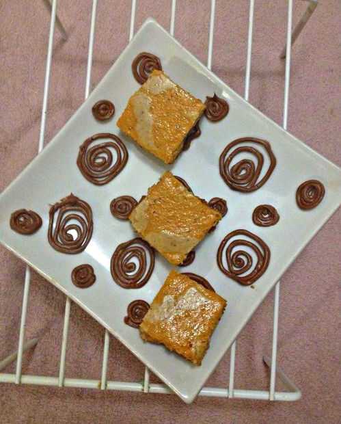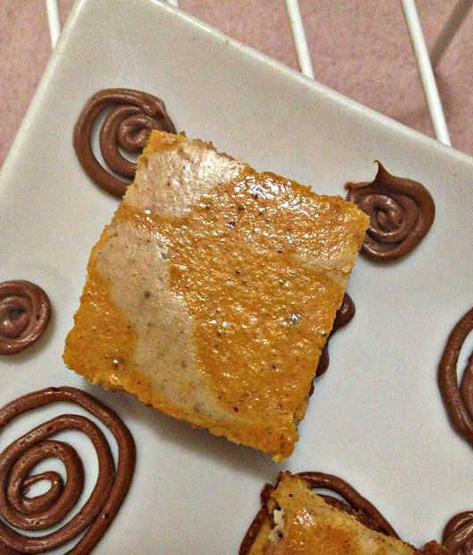 debido a la época del año, he estado pensando recientemente sobre recetas con calabaza. Finalmente me decidí a hacer una barra de chocolate similar a un Snickers, pero orientado más caída/calabaza. Estas barras tendría un turrón con sabor a calabaza