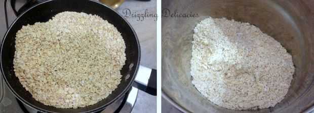 Carne asada seca de avena en una sartén a fuego lento durante unos 5-7 minutos. Obtendrá el aroma de las palomitas de maíz cuando se hacen. Blitz en un molino mezclador y formar en un polvo grueso.