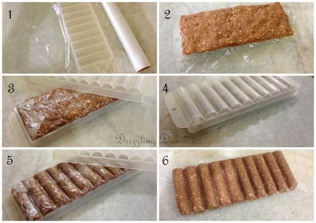 Lugar un film transparente en el molde (yo he utilizado una bandeja de hielo aquí) y uniformemente Esparza la mezcla de avena. Tápelo y deje reposar en la nevera 15 minutos.