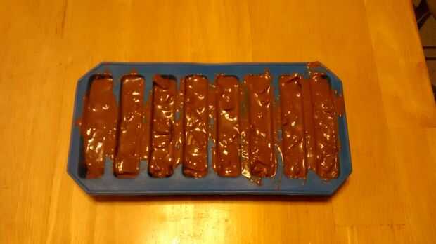 Descarga tus pedacitos de plátano en el chocolate y mezclar. Cuando se mezcla un poco poner en cada molde. Asegúrese de que golpee hacia abajo en la bandeja de las burbujas de aire y entrar el chocolate en las esquinas. Enfriar en la nevera por una hora hasta toda la noche. Entonces ellos pop y tienes un crujiente, no sana a todos, snack. Un poco algo que ha formado. Espero que todo el mundo le gusta.