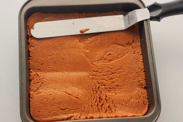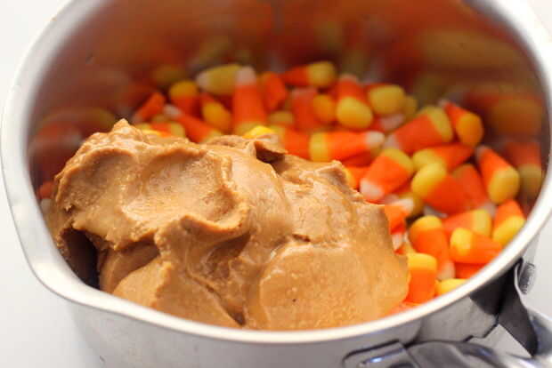Para la capa de maíz de caramelo de mantequilla de maní. En una cacerola pequeña en medio a fuego bajo colocar mantequilla y maíz de caramelo; que el maíz de caramelo fundir durante aproximadamente un minuto antes de añadir la mantequilla de maní. Coloque la mantequilla de maní en la sartén removiendo y asegurándose de que todo el maíz de caramelo se ha fundido con la mantequilla de cacahuete (de 3 a 5 minutos). Una vez agregar la capa sobre la parte superior de la capa crujiente y colóquelo en el congelador durante unos 5 minutos o hasta que la segunda capa esté firme.