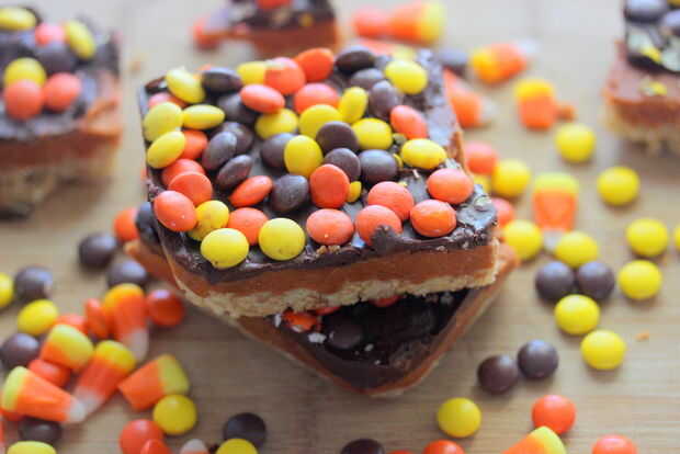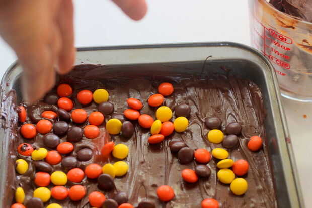 En un recipiente de microondas seguro Coloque trocitos de chocolate durante 30 segundos; una vez se ha derretido lugar encima de la segunda capa y agregar caramelos de mantequilla de maní. Cubrir la bandeja con plástico y colóquelo en el congelador hasta que el chocolate se ponga. Sacar del congelador y utilice un cuchillo trabajando los costados de la cacerola hasta que los lados se convierten en perder (el tratamiento puede necesitar descongelar sólo un poco). Cortar en barras y bares de almacenar en un recipiente hermético.