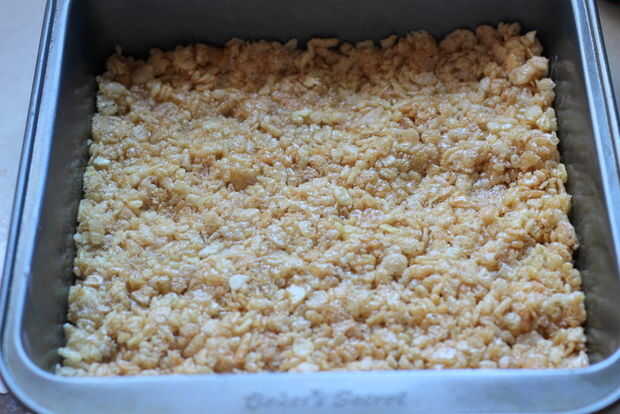 Instrucciones de la receta: Mantequilla un molde cuadrado de 8 pulgadas muy bien la cacerola y reservar; Coloque el cereal de arroz en un bol grande y reservar. Baja a fuego medio en una cacerola pequeña, agregar agua, el azúcar y el jarabe de maíz. Lentamente revolviendo la mezcla asegurándose de que el almíbar no toque los lados de la olla. Poner almíbar a hervir, usando un termómetro de caramelo, que la temperatura del jarabe de azúcar debe alcanzar 235 grados (si no tienes un termómetro de caramelo tome una cuchara y un lugar del jarabe de azúcar con agua fría; una vez que el almíbar forma una bola suave ha hecho). Retirar del fuego y agregar mantequilla y vierta sobre el cereal de arroz revolviendo rápidamente. Coloque la mezcla en el molde preparado.