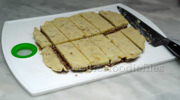Mina eran listo después de 1 noche en la nevera! Entonces, prueba con los dedos y tocar el relleno. Debe ser firme. Ver que bajo la capa ya no es líquido. Véase el cuadro 4 arriba! Tal vez, puede acelerar el proceso de ponerlos en un tazón congelador en el congelador! Creo que eso puede funcionar. Ahora, lo saca de la nevera y sacarlo de la bandeja del horno y cuidadosamente el papel para hornear. Coloque la cosa en una tabla grande para picar y cortar con un cuchillo afilado en bares o en cualquier forma que desee, depende de usted! :) tenia 11 bueno - tamaño barras! Disfrute después de estar en la nevera, después de 5 a 10 minutos apenas como eso con un vegano buen café con leche o con algún té de coco! ;) MMM! :) Guárdelos en una caja de galletas en la nevera frío!!!!!!