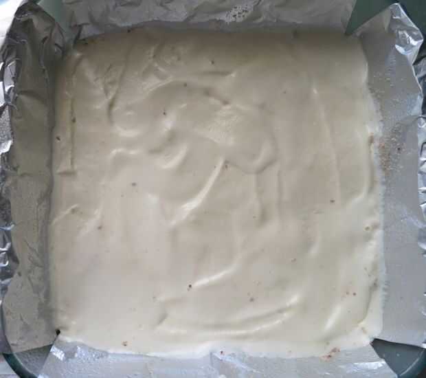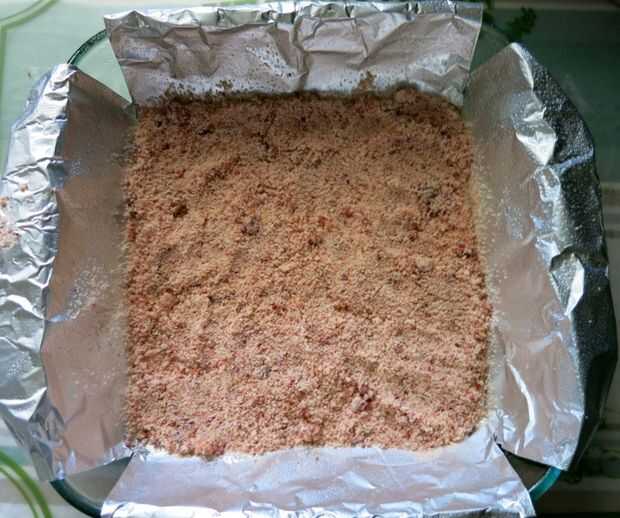Cubra con otro tercero (en mi caso mitad) de la mezcla de migas restantes. Usé un pedazo de papel encerado para empujar suavemente las migajas en el helado.
