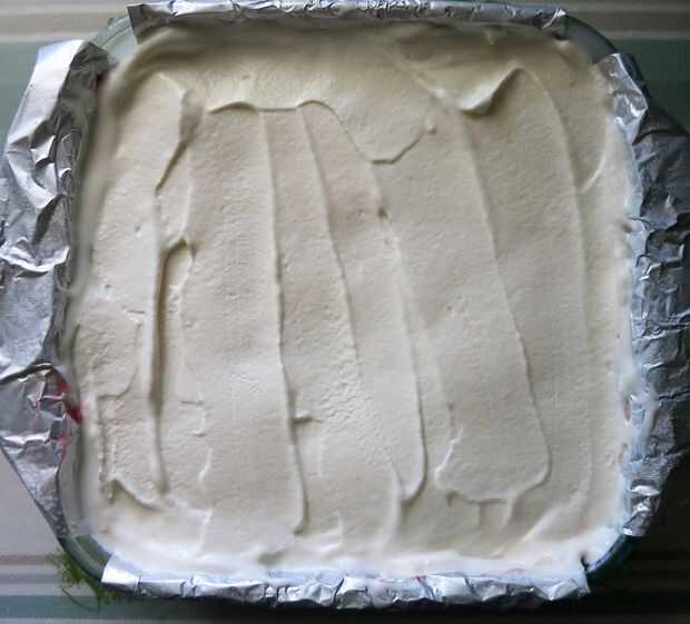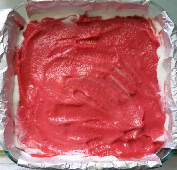 Cuando el helado ha suavizado (puede ponerlo en un bol y trabajarla con una espátula) propagación de las pintas en a la parte inferior de la bandeja en una capa uniforme sobre las migajas. (Mi helado era muy suave, que he decidido congelarlo unos 10 minutos para configurar un poco así que podría apoyar el sorbete. Si encuentra que cualquiera de las capas de helado/sorbete obtener demasiado suave en cualquier momento, simplemente congelarlas unos 10-15 minutos antes de añadir la siguiente capa.)