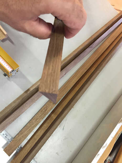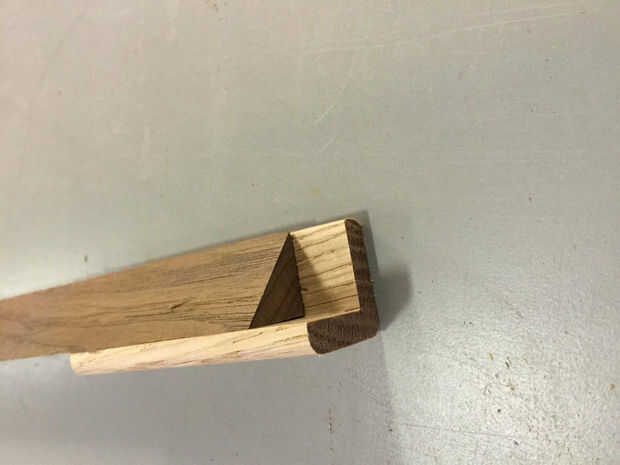 Configurar la tabla de la sierra para un corte de 45 º (lo siento no hay fotos) y ejecutar la acción. Hacia el tablero y hacer un triangulo que se ajusta al interior de la moldura de esquina.