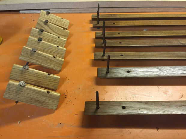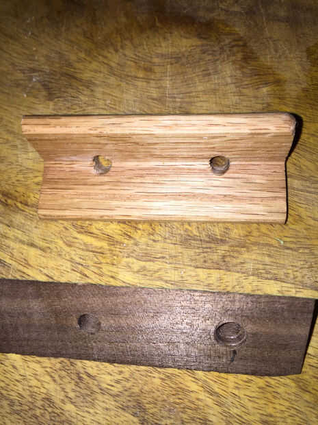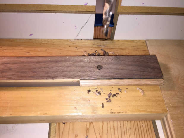 Hice una plantilla simple para mantener el stock cortando un canal V en una chatarra 1 "x 4". La mesa del taladro se configura con una valla trasera y un bloque de tope para perforar un agujero de 2.5" del final. Se añade un bloque espaciador de 2" para el segundo agujero en. 5" del final.