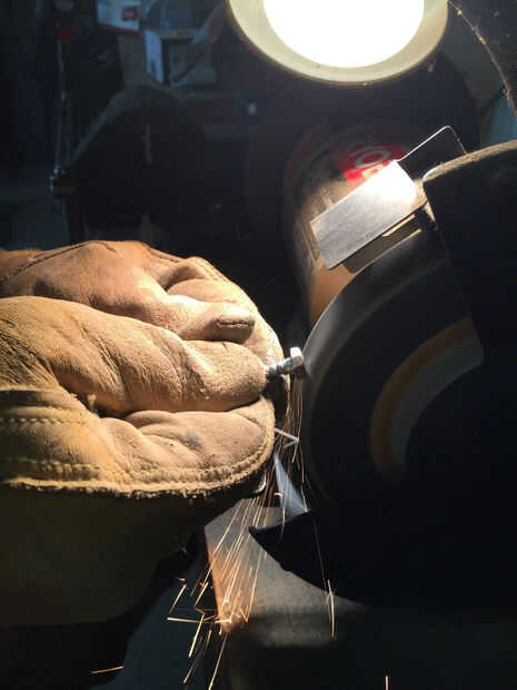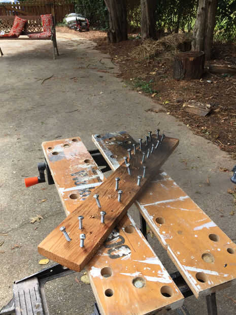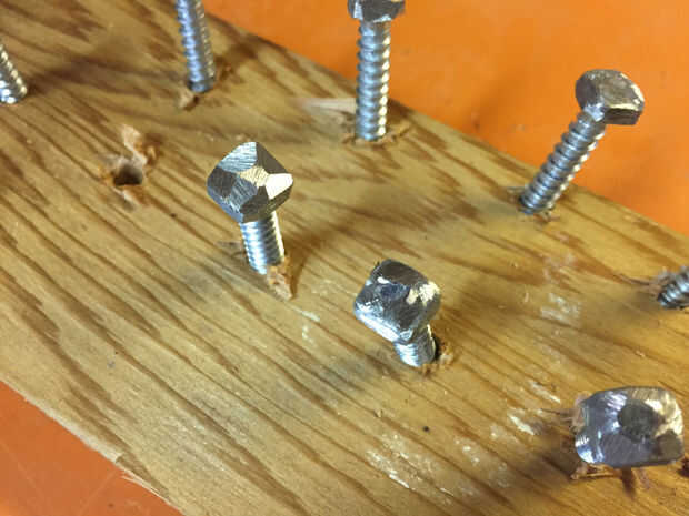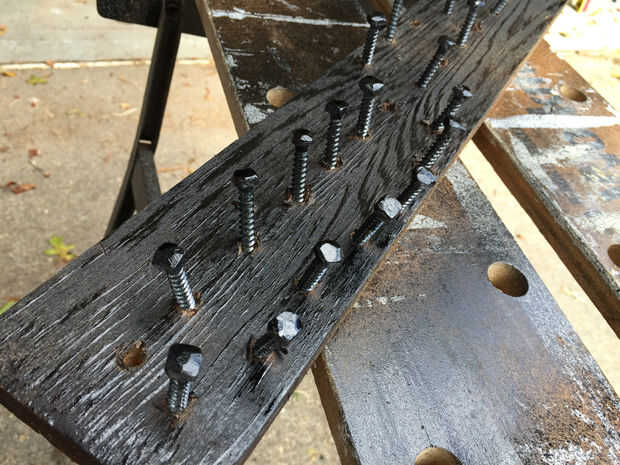 Comenzando con los pernos de 1/4 "x 1,5" poner las cabezas de los pernos a la amoladora los cuadrados y crear un martillado o buscar. Les terminé pintura en aerosol negra y estaba muy contento con el resultado.
