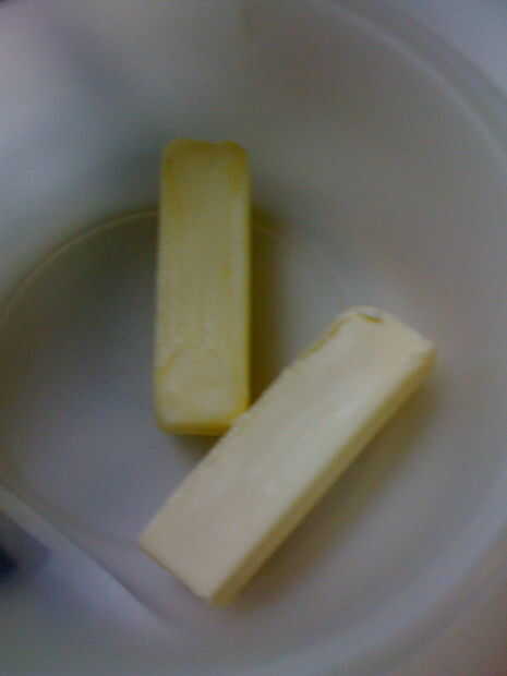Tomar tus 2 barras de mantequilla y dejarlas sentarse sin envolver en su tazón hasta que llegan a temperatura ambiente. También puede indicar cuando la mantequilla empieza a ser suave. Esto tomará algún tiempo. Bien después de que usted consiga precalentar el horno a 350.