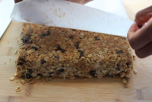 Instrucciones de la receta: Precalienta el horno a 350 grados, grasa y línea de un molde para hornear de 8 * 8 con papel sulfurizado y reservar. En una placa para horno mezclar avena, coco y semillas de girasol y colocar en el horno durante 10 minutos. En una cacerola mediana sobre fuego lento lugar miel, mantequilla de maní y azúcar, llevar la mezcla a un revuelo de hervir y apagar el fuego. Sacar hoja de hornear horno y deje enfriar el avena.