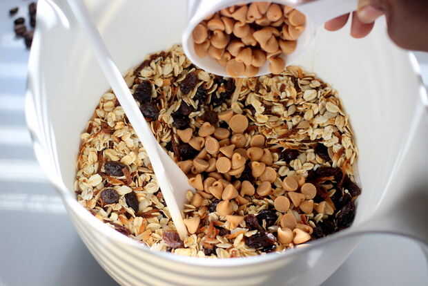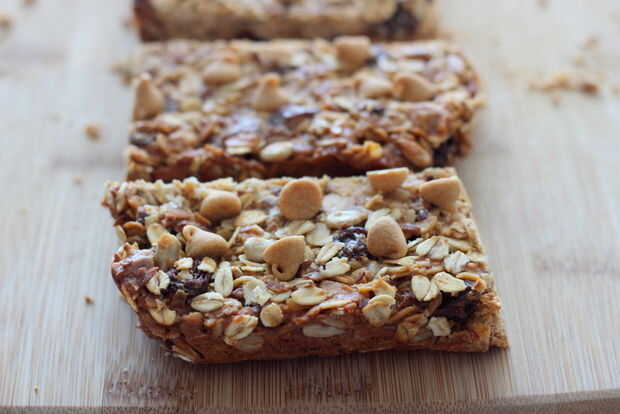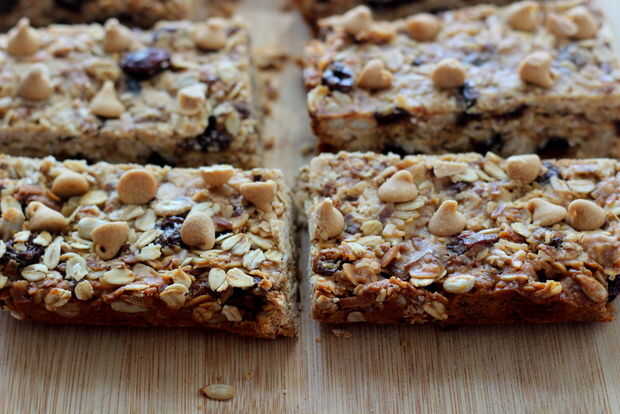 Lugar una vez fresco de avena en un tazón grande agrega chips de mantequilla de maní mezclan y poco a poco agregue la mezcla de miel a los bolos. Revolver y añadir a la bandeja para hornear, presione hacia abajo y colóquela en el horno durante 15 minutos. Deja enfriar, refrigerado por minas durante la noche. Cortar y guardar en recipiente hermético.