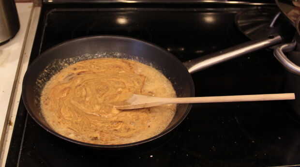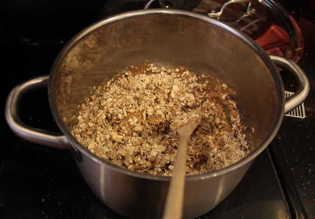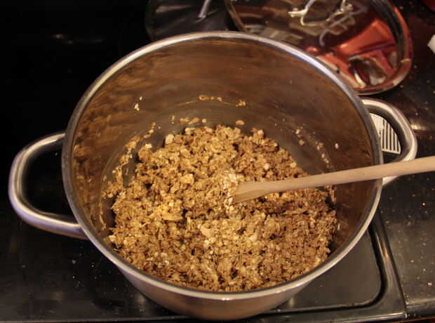 Vierta los ingredientes húmedos a los ingredientes secos y revuelva juntos bien hasta que todo está cubierta uniformemente. En este punto he añadido pepitas de chocolate que se fundían inmediatamente en la mezcla pegajosa.