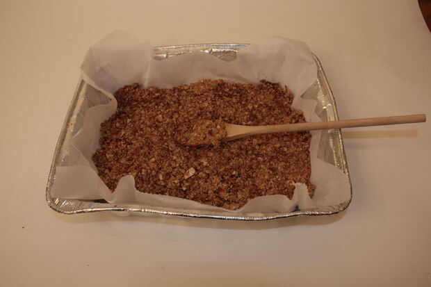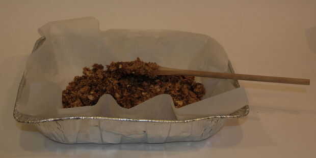 Ya que no quiero ensuciar mi pan, primero alineado lo con papel sulfurizado. Luego volcar la mezcla en el molde y presionar con el dorso de una cuchara para que la capa es uniforme. En este punto decidí que más chocolate era necesario así que presioné unos trocitos de chocolate en la parte superior de la bandeja (tenga una adicción).