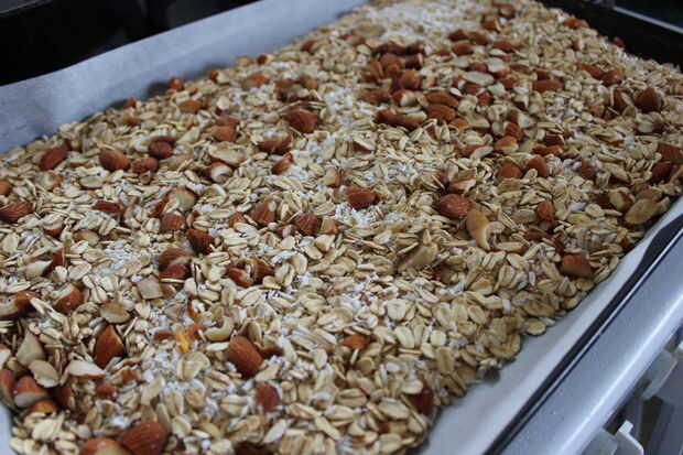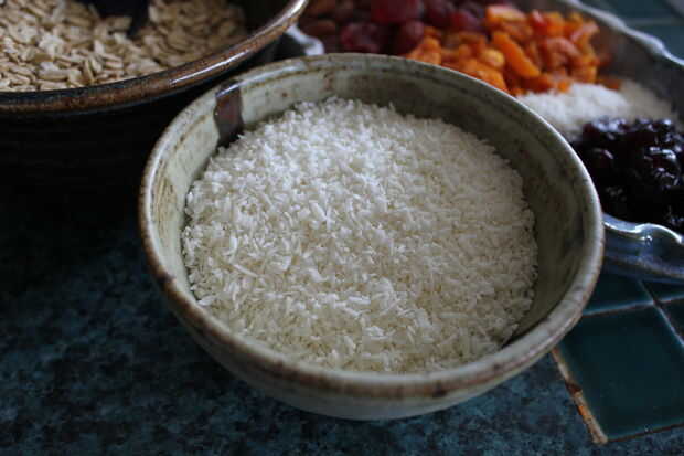 Extendió de avena, coco y nueces hacia fuera en una bandeja en una capa uniforme.