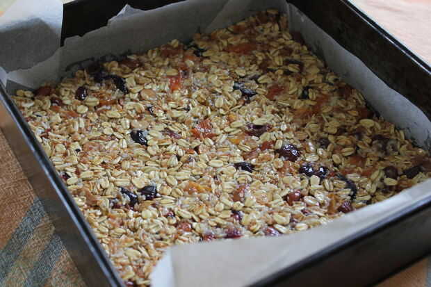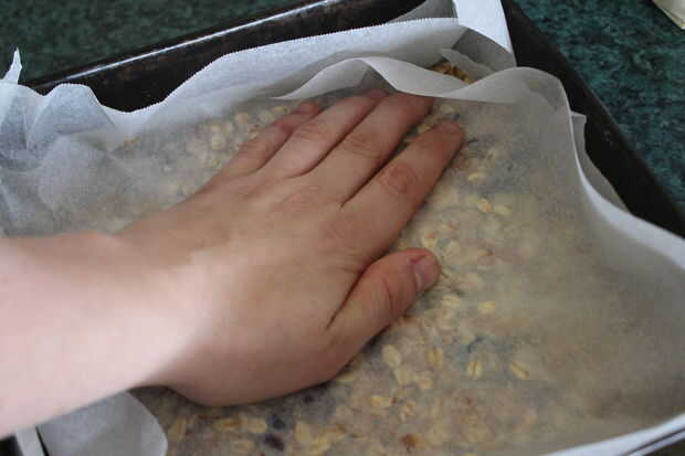 Aplanar la mezcla. Si usted no aplana la mezcla muy bien, las barras de granola se deshagan más fácilmente. Me gustaria colocar una hoja de pergamino o papel encerado sobre la mezcla y aplanar abajo bien con mi mano o con el fondo plano de un cristal. Así tus manos no te todo pegajosas.