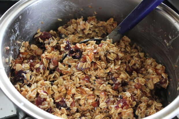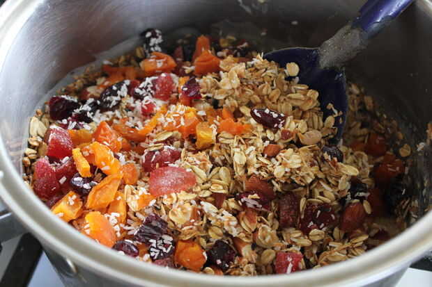 Añadir los ingredientes secos, incluyendo sus frutos secos picados y revuelva para mezclar bien y distribuir uniformemente todos los ingredientes.