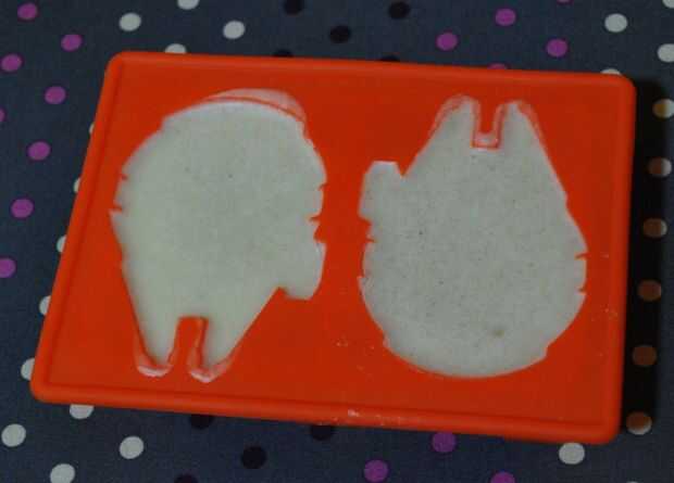 - Establecerá el molde a temperatura ambiente o en la nevera, pero puesto que el molde es bastante intrincado, tenía los mejores resultados endurecer las barras tanto como sea posibles mantener el halcón intacto (especialmente las dos piezas en la parte delantera)