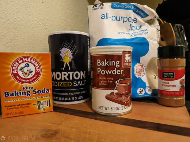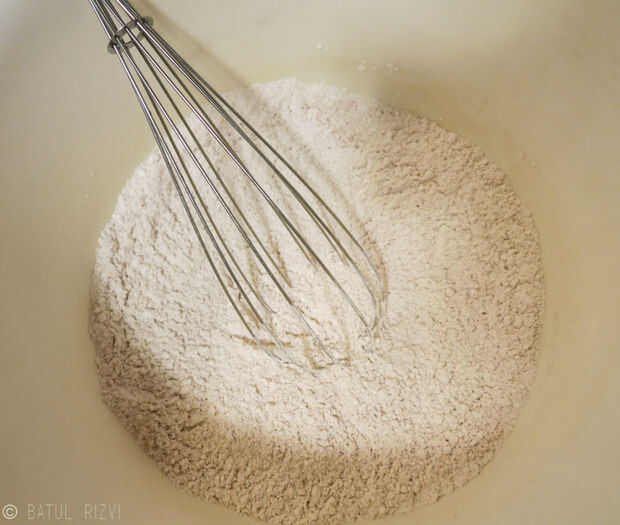 Empezar con un recipiente nuevo. Añadir primero la harina y batir hasta desaparecerán grumos. Añadir el resto de los ingredientes secos y batir hasta homogéneo.